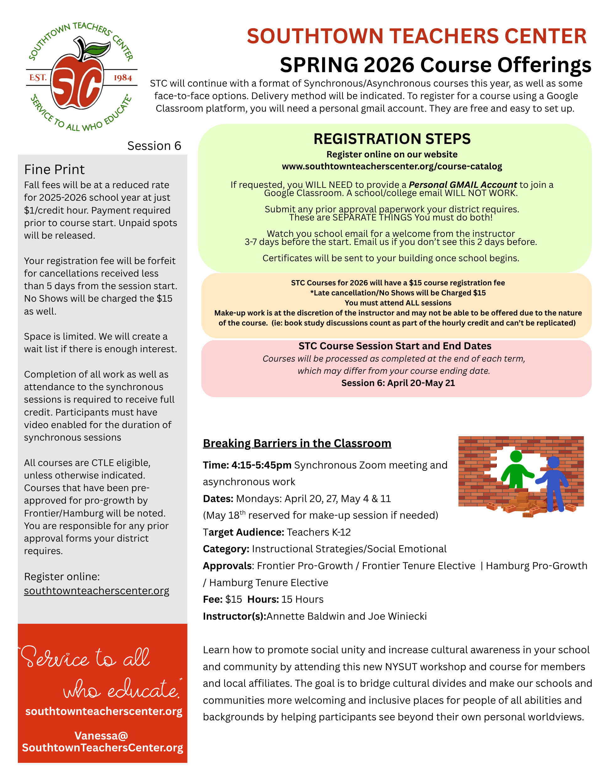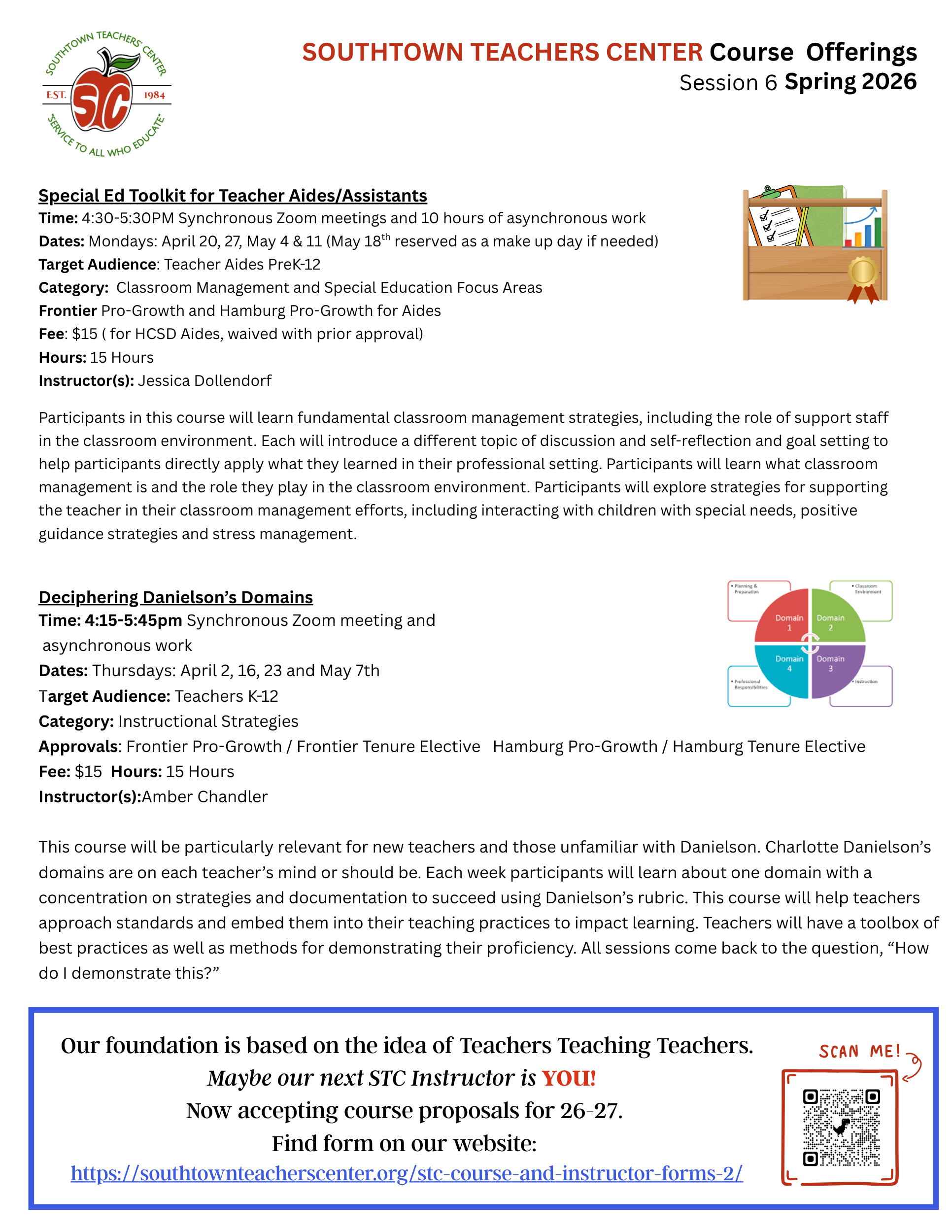 Questions? Call 649-6775 or email Vanessa@SouthtownTeachersCenter.org