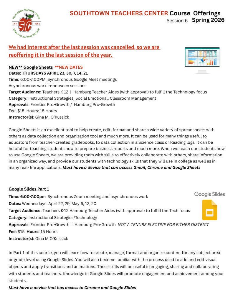 Frontier and Hamburg faculty and staff will be notified of new Pro-Growth offerings directly through their school email. Registration link for each course is found after the dates/instructor.