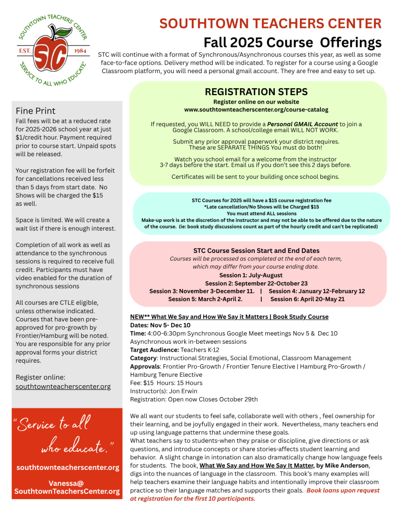 For full descriptions of courses/workshops currently being offered click here ->SOUTHTOWN TEACHERS CENTER COURSE FALL-2 25 (3)