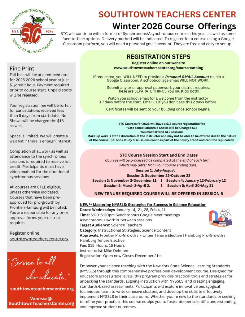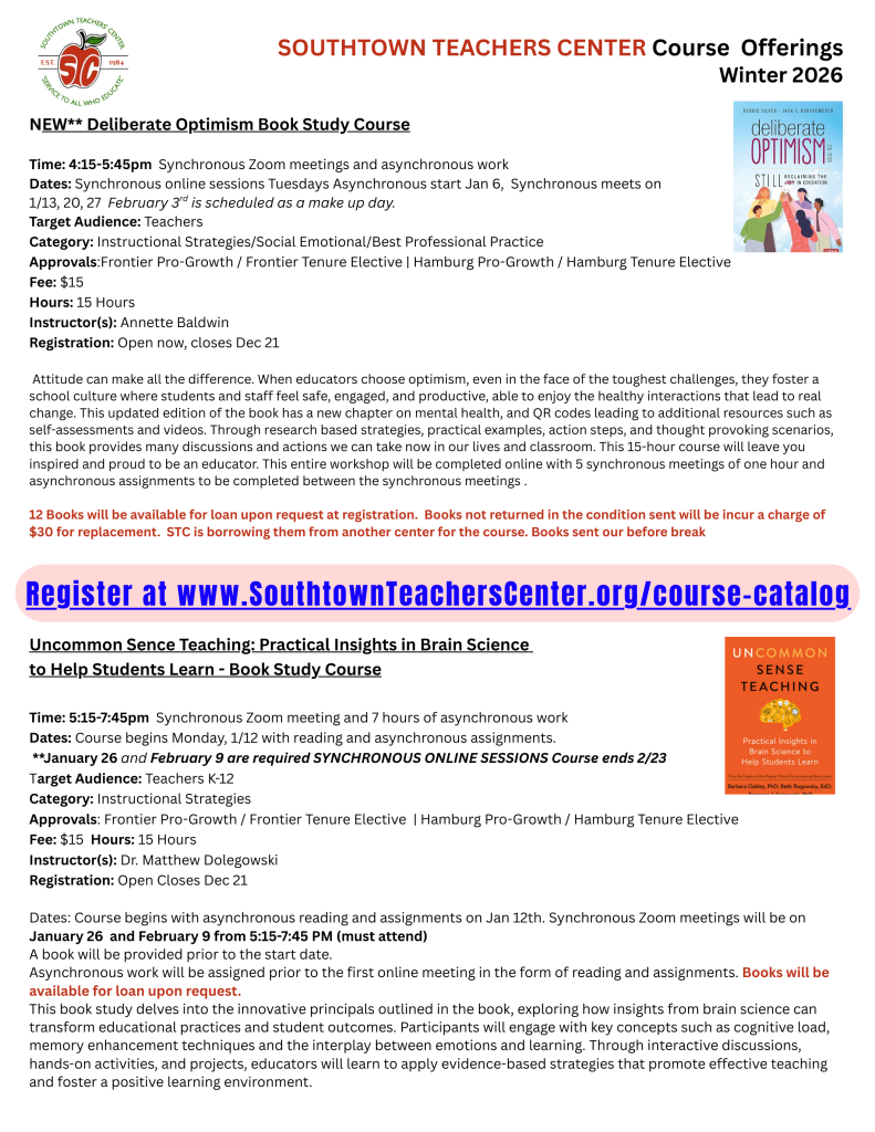 For full descriptions of courses/workshops currently being offered click here ->SOUTHTOWN TEACHERS CENTER COURSE Winter-4 25 26