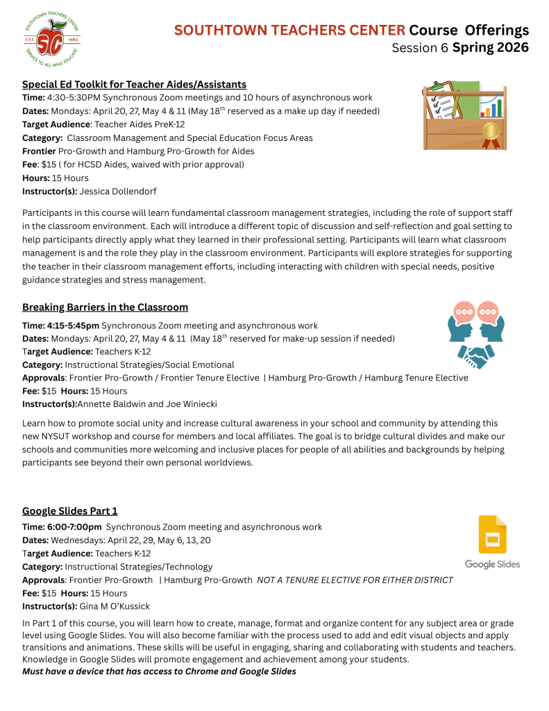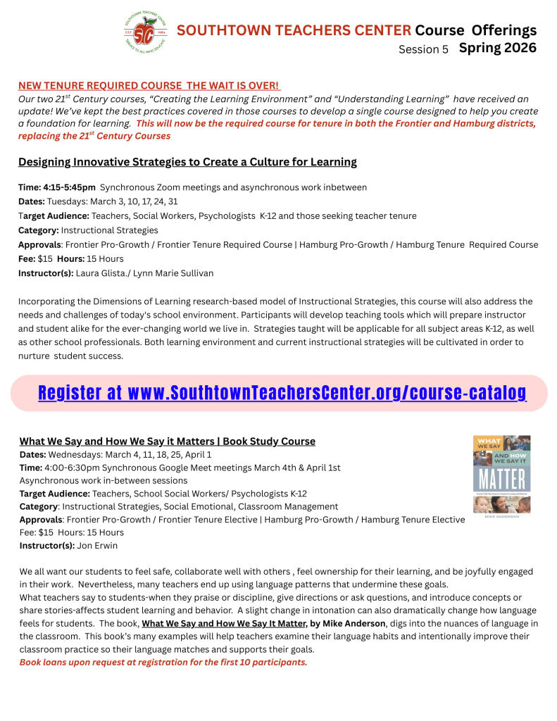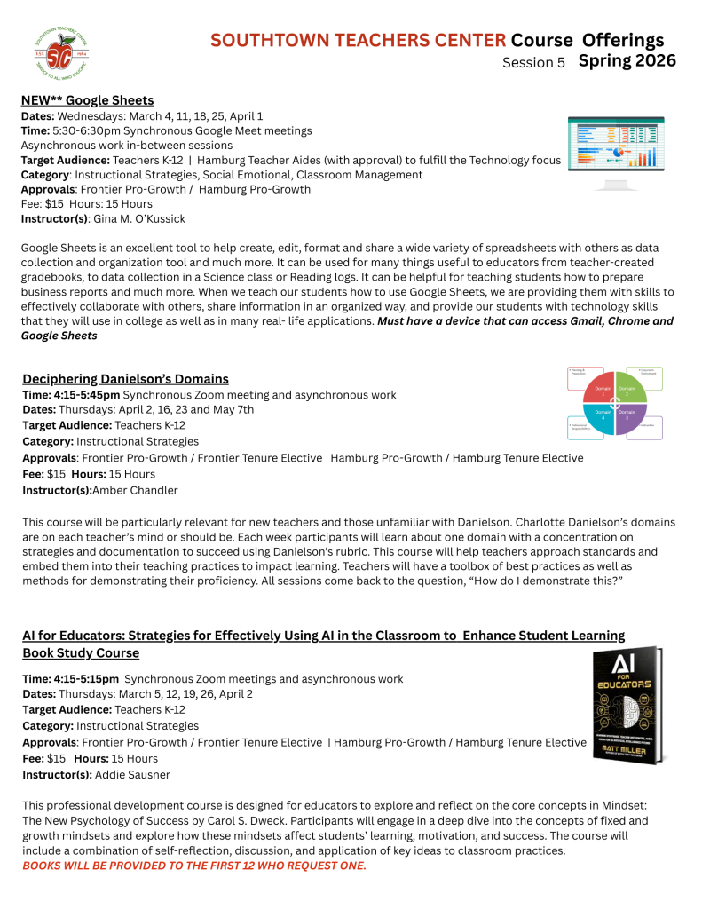 Frontier and Hamburg faculty and staff will be notified of new Pro-Growth offerings directly through their school email. Registration link for each course is found after the dates/instructor.